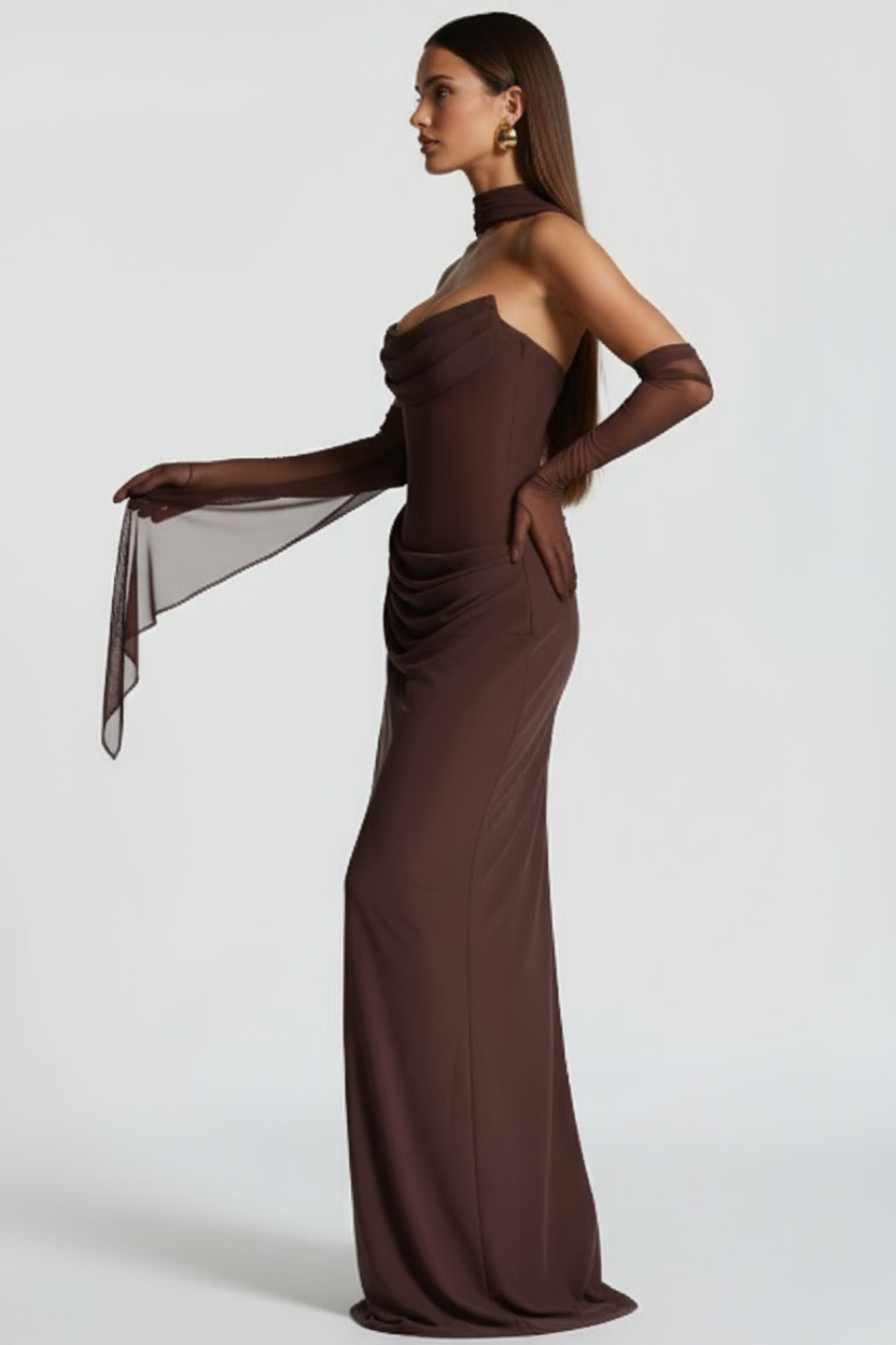 A modelagem A-line proporciona caimento elegante que favorece todos os tipos de corpo. O comprimento longo até o chão cria presença majestosa, enquanto a cintura natural marca delicadamente a silhueta. O ajuste regular oferece conforto durante todo o evento. O design sólido e atemporal permite uso em todas as estações, tornando este vestido uma peça versátil para casamentos, festas elegantes e celebrações especiais.