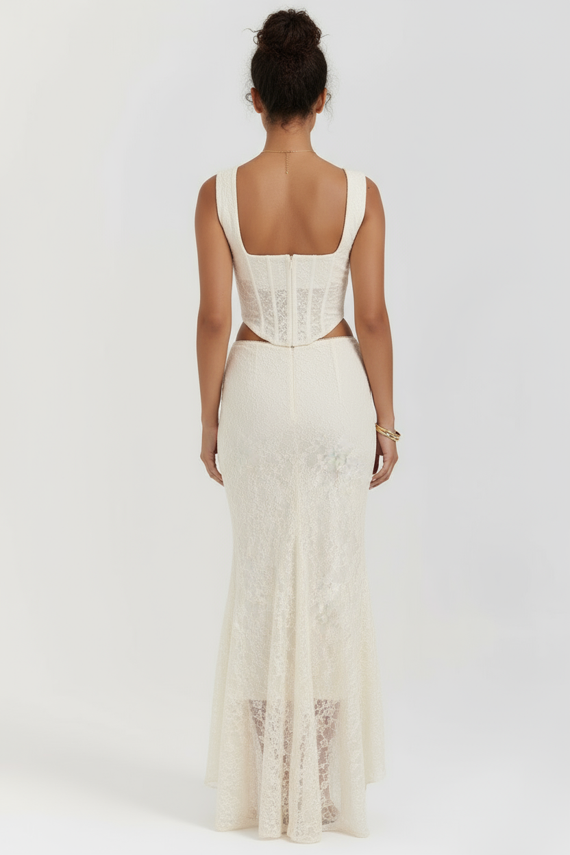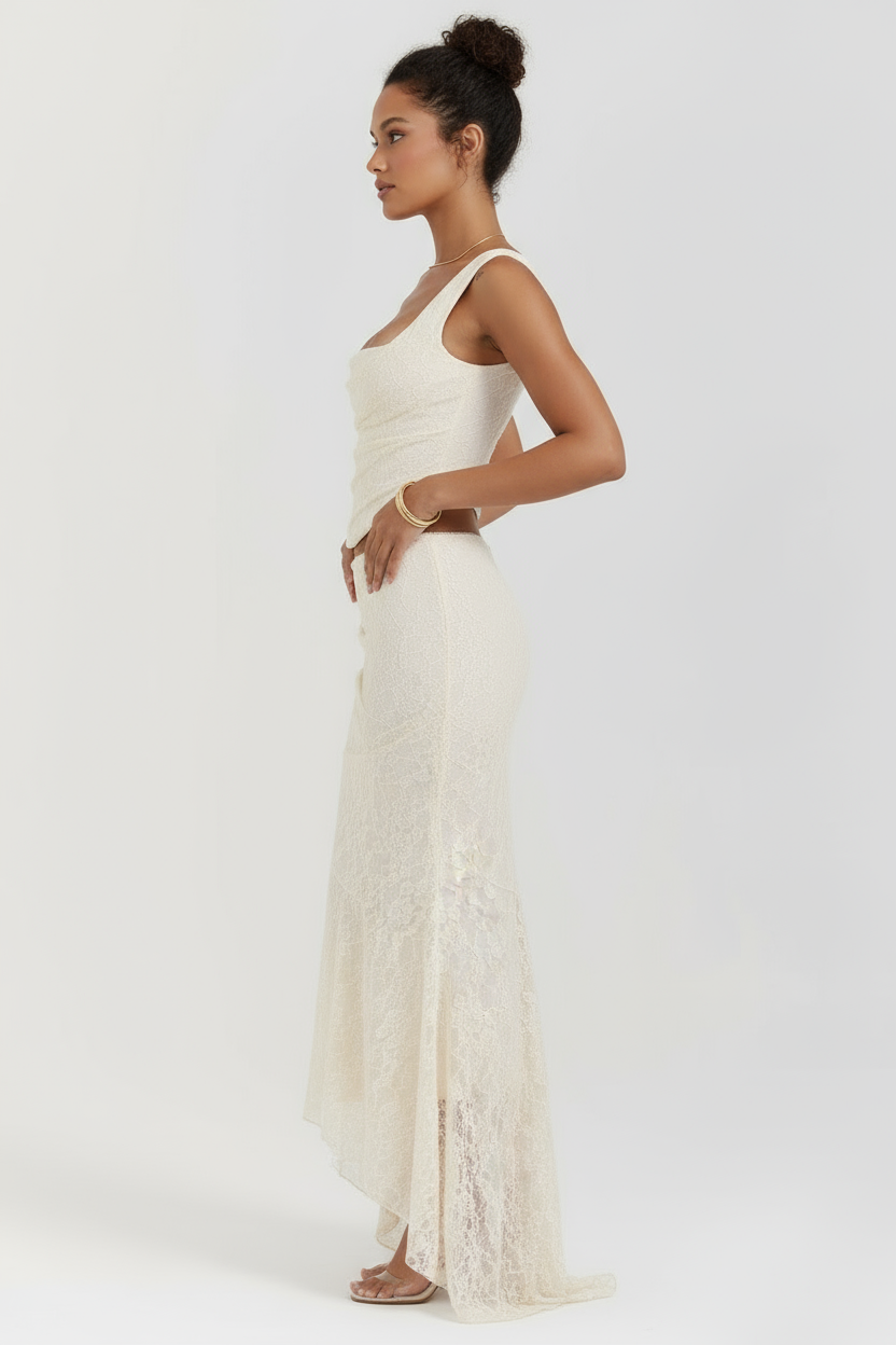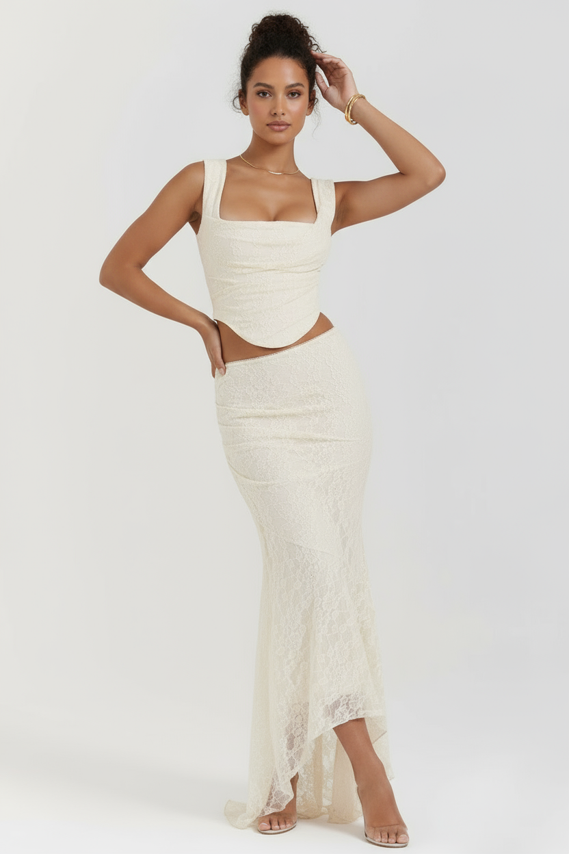 O top sem alças apresenta costas nuas que criam um visual ousado e elegante. A modelagem slim valoriza a silhueta de forma sofisticada. A saia longa até o tornozelo com cintura elástica proporciona conforto e movimento fluido. O comprimento curto do top combinado com a saia longa cria uma proporção equilibrada e moderna. Perfeito para eventos noturnos, festas e ocasiões especiais onde você deseja se destacar com estilo.