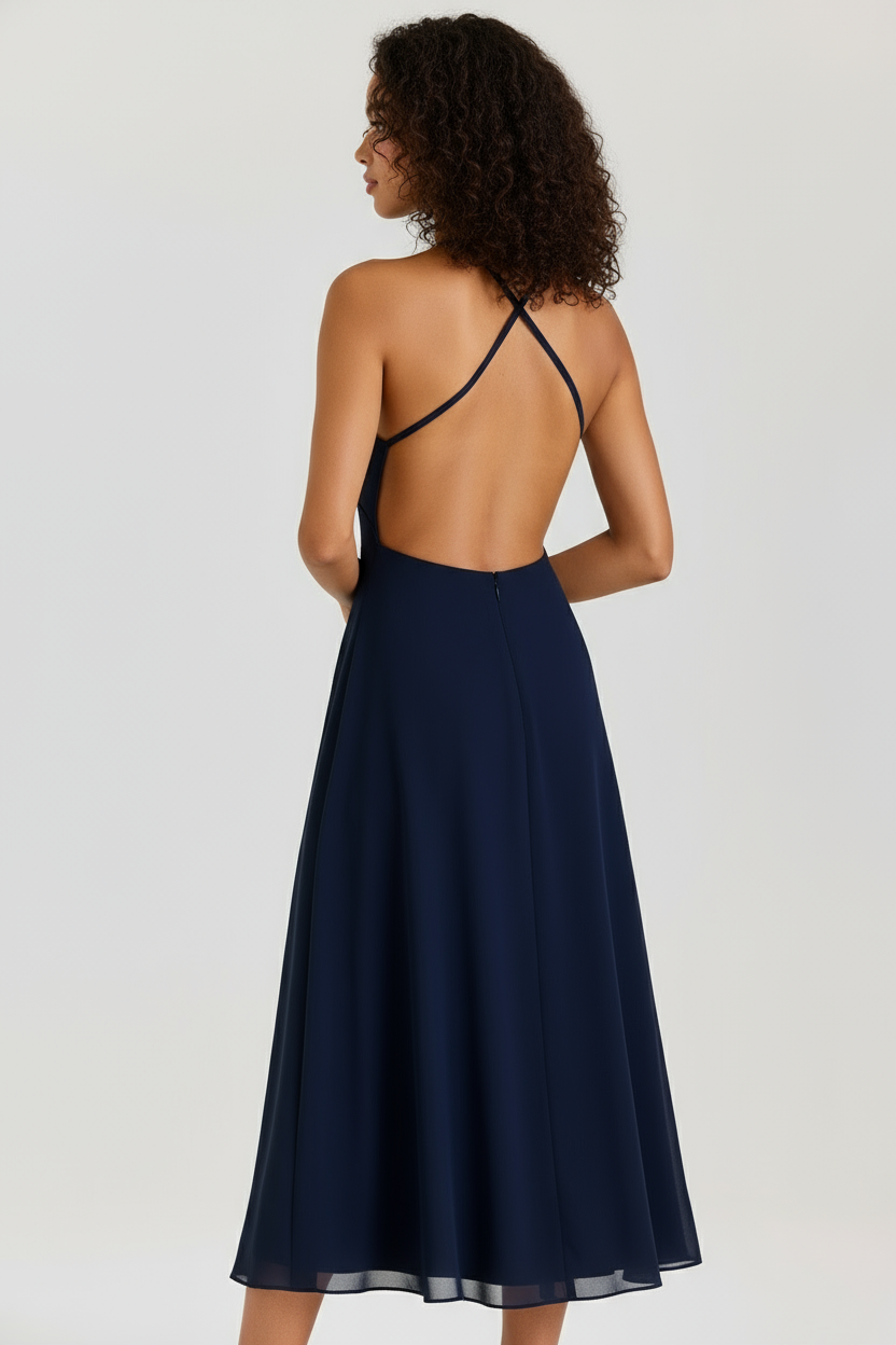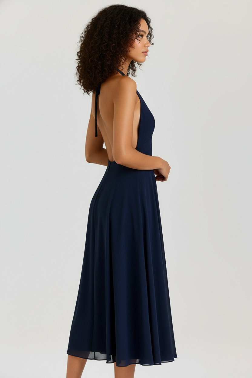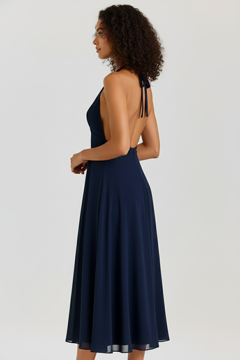 O decote em V sem mangas cria um visual elegante e feminino, enquanto as costas nuas adicionam um toque ousado e minimalista. A cintura regular proporciona caimento lisonjeiro que realça a silhueta natural. O comprimento midi e o design retro com gola Victoria criam um visual clássico e sofisticado. A cor sólida permite que você destaque seus acessórios e sapatos, tornando este vestido versátil para diversas ocasiões, desde passeios casuais até eventos mais formais.
